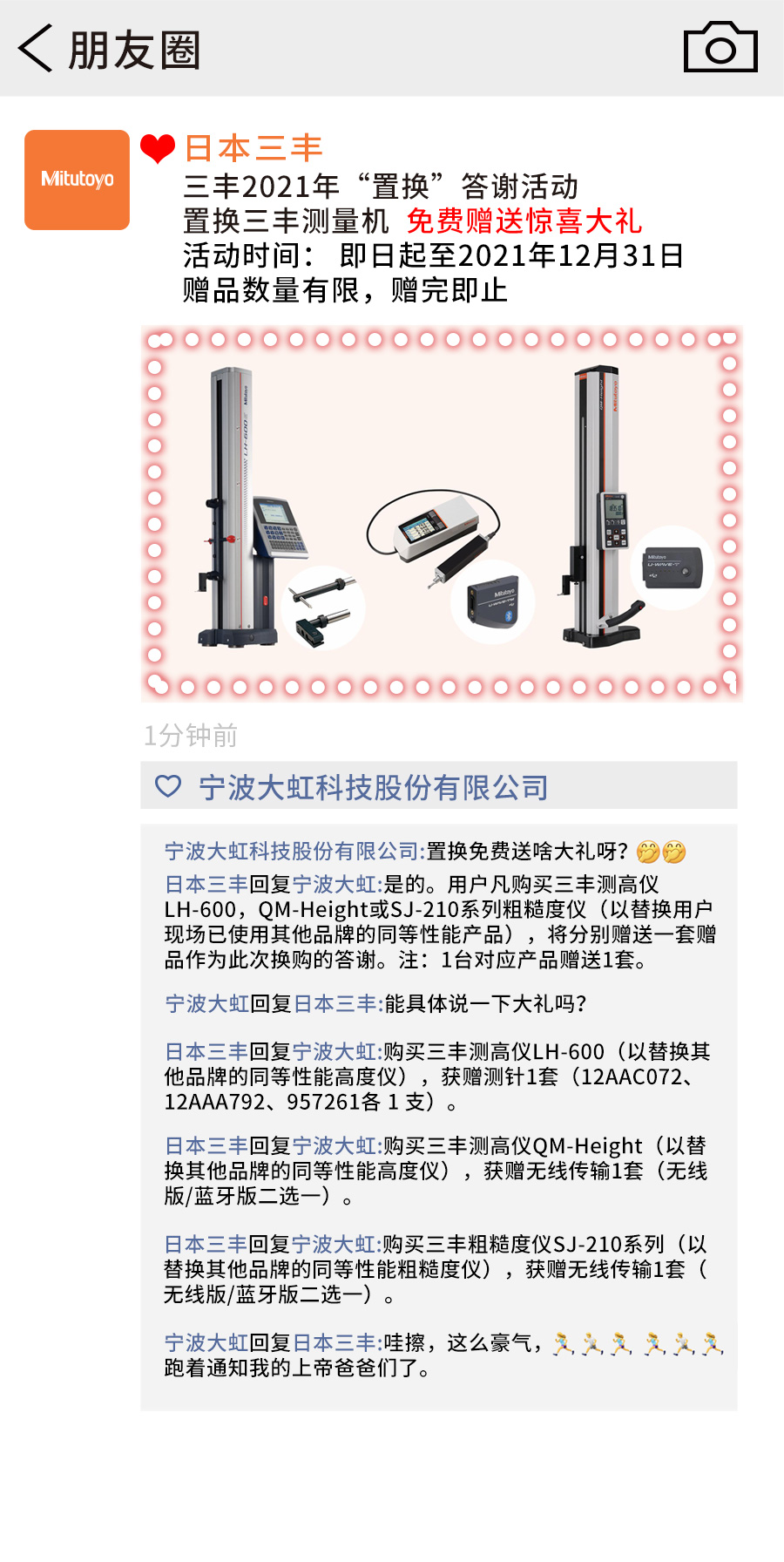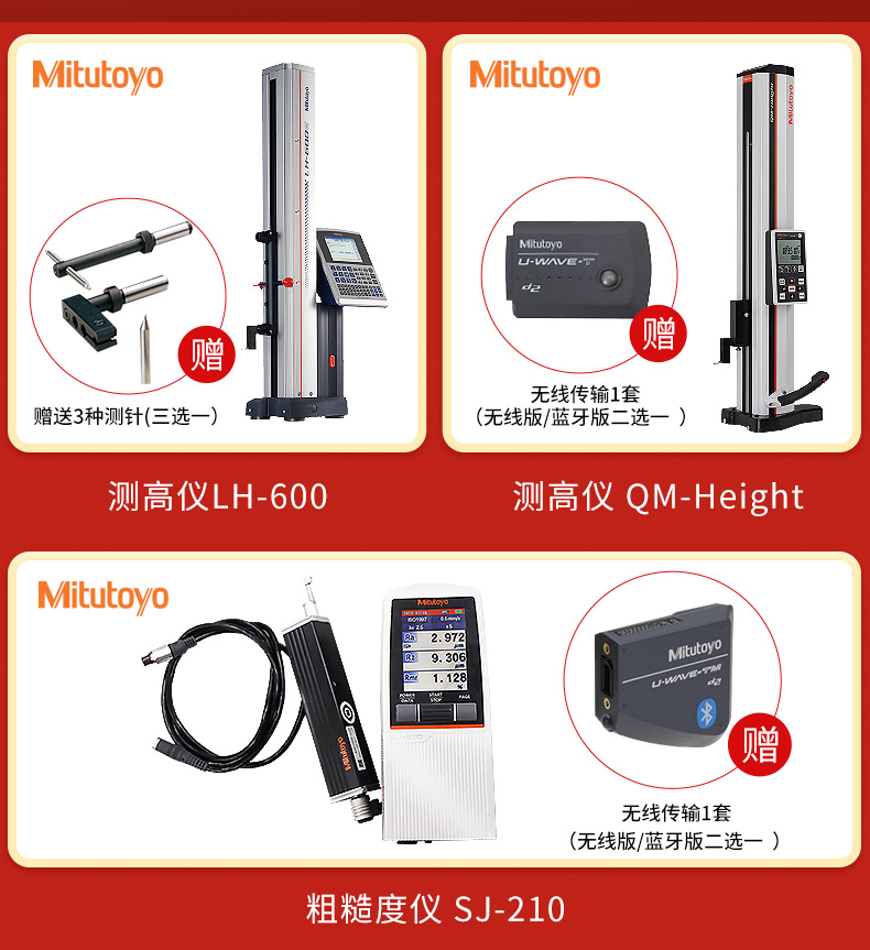 用户新规购买三丰测高仪LH-600,QM-Height或SJ-210系列粗糙度仪(以替换用户现场已使用其他品牌的同等性能产品),将分别赠送一套赠品作为此次换购的答谢,1台对应产品赠送1套。