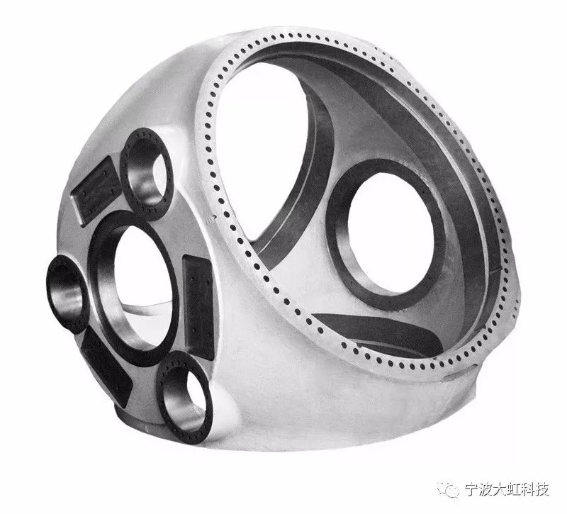 风电行业持续创新增长,在加工生产中遇到的金属切削挑战也随之而来,例如风电组件中的轮毂。由于轮毂是风电机组重要的零部件之一,其结构和受力变形复杂,它将直接影响到风力发电机组的正常运行和使用寿命。因此 它具有强度高、可靠性好、疲劳寿命长、吸振性强等特性,以满 足-20~-40℃的使用工况。常见的材质为铸态低温高冲击韧性球铁。风电轮毂体积巨大,一般加工周期很长。如何实现高生产率加工,降低成本,大虹给出了这样一套解决方案。