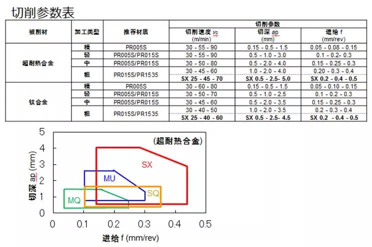京瓷针对难加工材耐热合金的不同工况下的推荐值