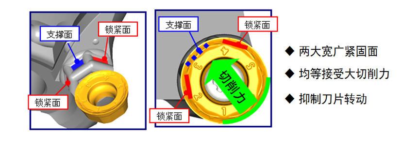 平板锁紧结构确保刀片紧固,抑制粗加工中刀片受力移位